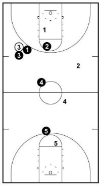Similar starting formation to a 3-1-1 press, except that in the 1-2-1-1 press the front middle player starts close to the baseline pressuring the inbounder instead of starting around the free-throw line.