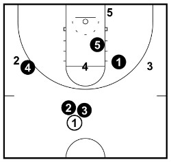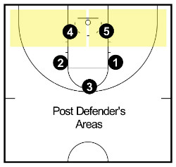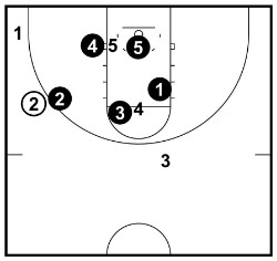 The strong-side post player gets up in the lane to cut off the pass to the corner player, the weak-side post player stays on split line, and then the weak-side wing player must try and read the eyes of the passer and intercept the pass to one of the two other offensive players on the court.