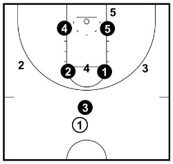 4. Rebound – As with all zones, on each shot attempt, every player must find someone to box out and then go after the rebound.