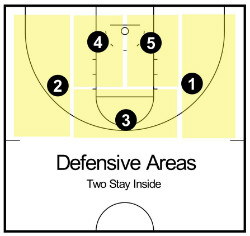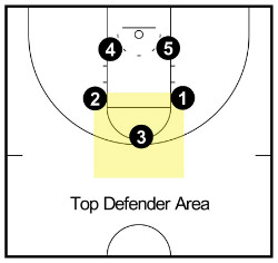 The two post defenders must have a foot inside the key when the basketball is at the top. This way we have presence on the inside but can also close out to the corners if a pass is made there.