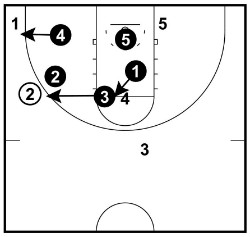 Same as the wing to corner pass, if the basketball is skipped corner to corner, the weak-side wing closes out on the high side to prevent the reversal pass and is then bumped up away by the recovering post player.