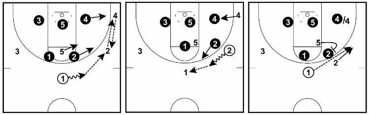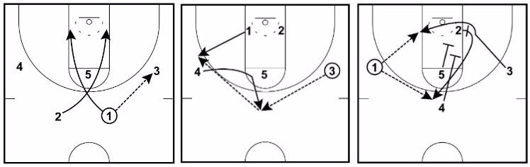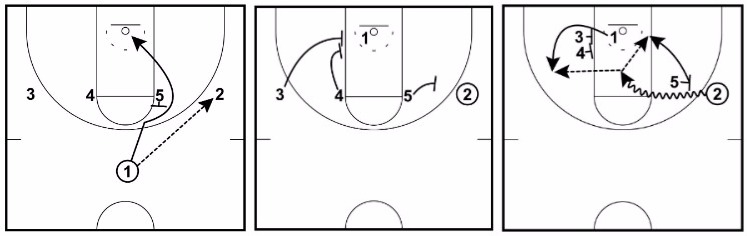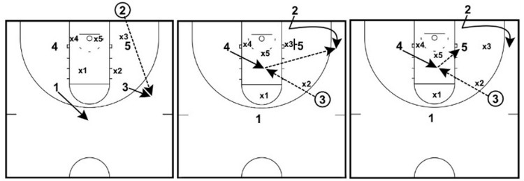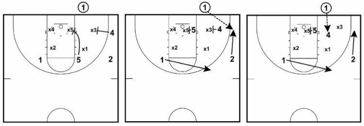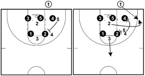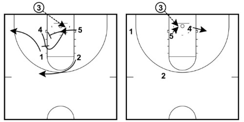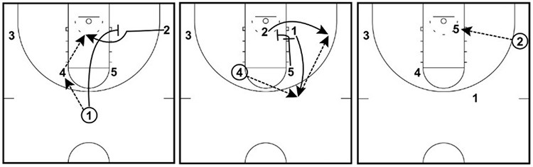 4. 5 will set a screen on the low ball-side post player and 2 will curl around to the corner to catch the pass from 4 and take the three-point shot.