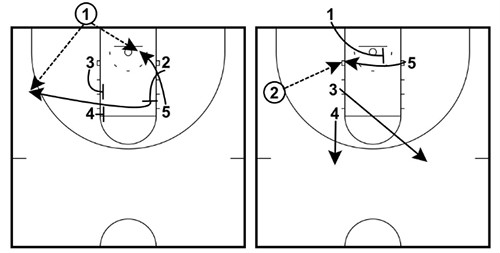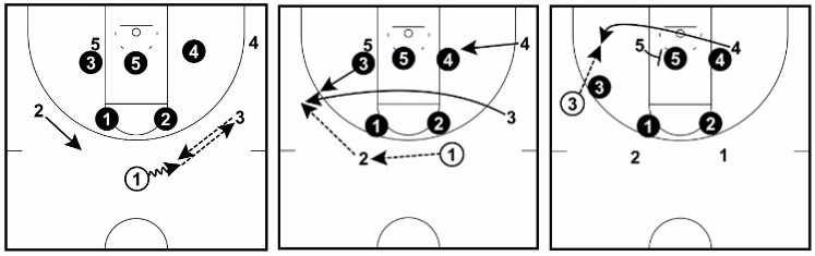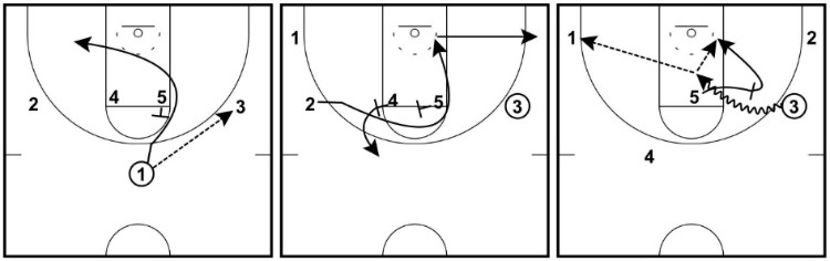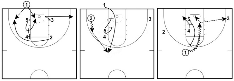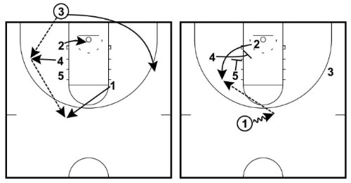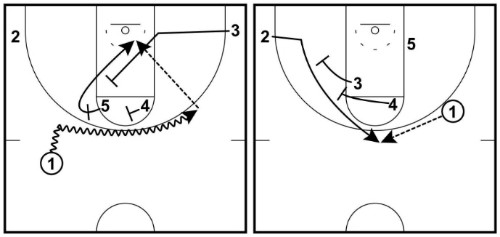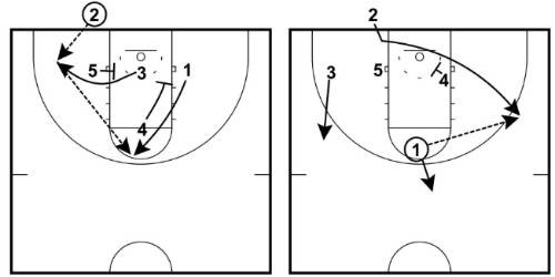 5. After screening for 1, 5 immediately sets another screen for 2 who cuts out to the wing.
