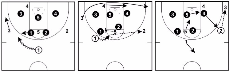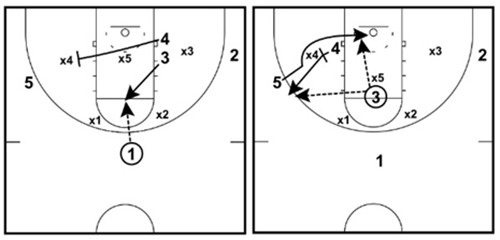 - If 3’s defender stays in the key to deter the pass, 3 can pop to the top of the key off a quick screen by 4 for the open shot.