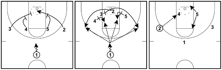 3. 4 and 5 set a staggered screen for 1 as they dribble around the top of the key.