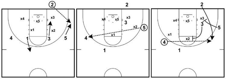 3. 2 cuts towards the ball-side corner and should be open for the pass and shot if 4 and 5 have done a good job of sealing their opponents.