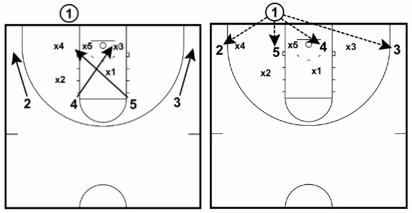 1. The play starts with 1 passing to either of the two post players on the elbow. Preferably the side with the best shooter on the wing.
