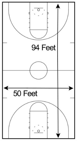 The court is a rectangle which can vary slightly in dimensions. Generally 94 feet in length and 50 feet in width.