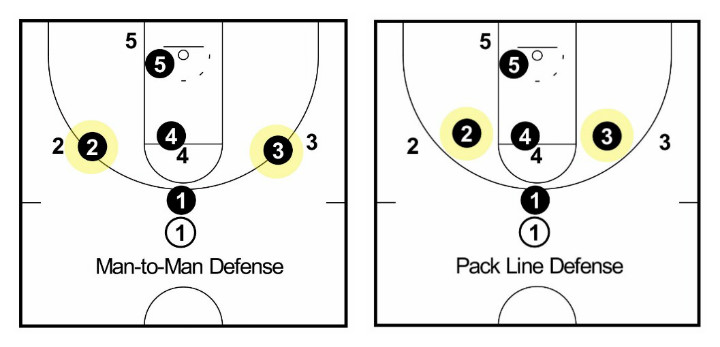 In the Pack Line defense, every defender has an opponent. Defenders have to chase their opponent around the court, fight through screens and defend all over the court.