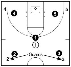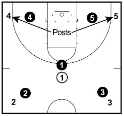 On this signal, the two post players move to the baseline corners and the two wings move to the half-court corners.