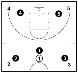 The offense involves four players standing on all the four corners of the half-court and one player with the basketball in the middle.