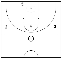 Traditionally, this will mean your point guard at the top, your shooting guard and small forward on the wings, one big on the free-throw line, and one big on the baseline.