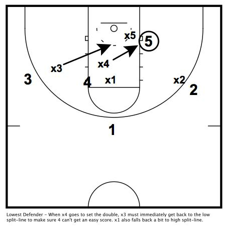 The defender of the second lowest offensive player must IMMEDIATELY drop back to the low split-line to protect the paint and watch the lowest defender. The defender at the top of the key must drop back the the high split-line.