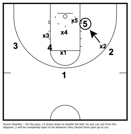 This tactic should only be used against teams that can’t shoot the three-point shot so the guard doubling should return to their player once the ball’s been passed out.
