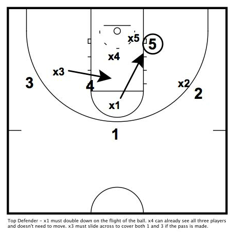Like the tactic above, both players are now responsible for the three offensive players on the weak side of the court and must scramble once the pass is made. Both are looking to get steals off bad passes from the post player.