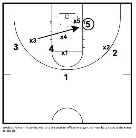 Both players are responsible for the three offensive players on the weak-side of the court and must scramble if a pass is made to any of them. They must look to get steals off bad passes from the post.