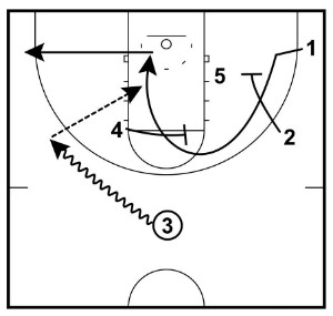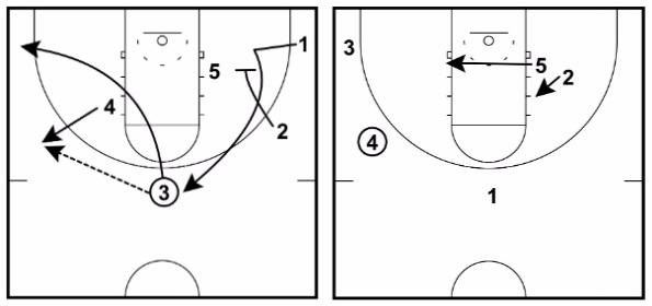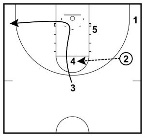 After making the pass, the 3 will immediately cut off the high post looking for the quick bounce pass or hand-off leading to a layup. If 3 doesn’t receive the pass, they clear out to the corner.