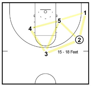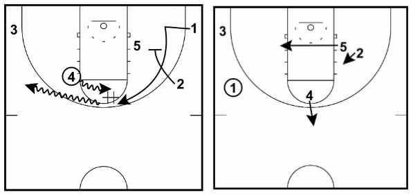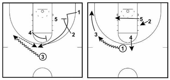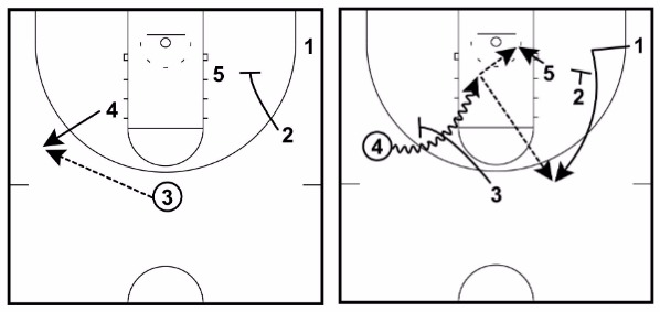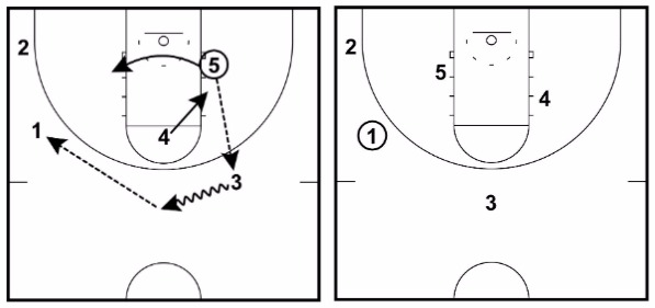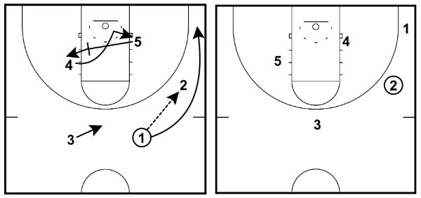 This will often lead to 1 getting an open midrange or three-point shot, a drive in for an open layup, or a pass to either 3 or 5 on the drive to the hoop.