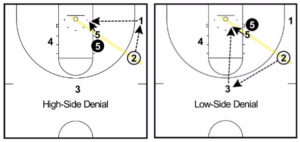 The logic behind this concept is that as long as the trigger (2), the low post (5), and the basket form a straight line, the defender will be forced to play behind the post player.