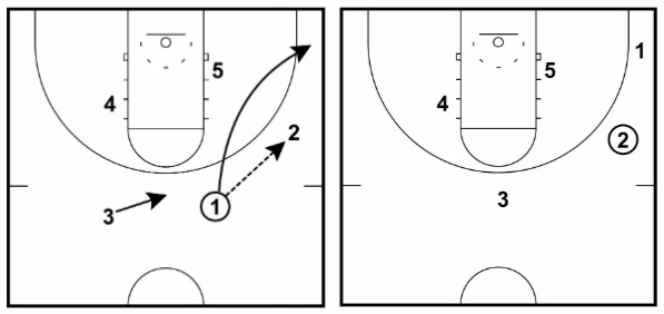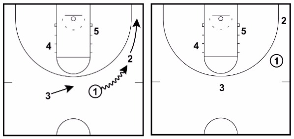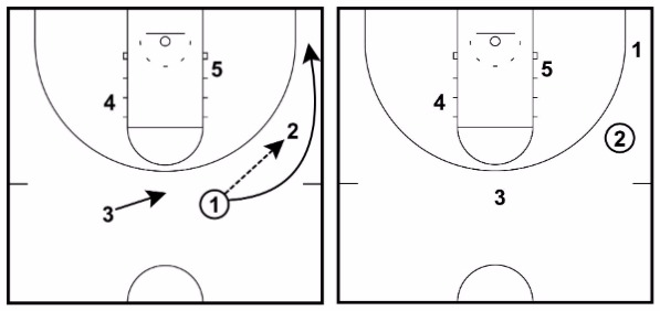 3 immediately cuts to the ball-side corner and 1 will fill the position at the top of the key after cutting off 1’s down screen.