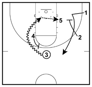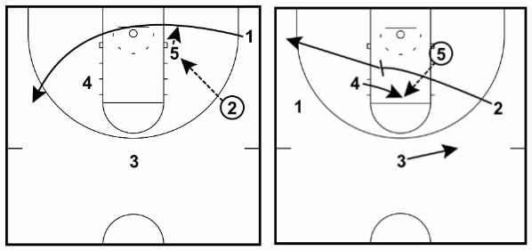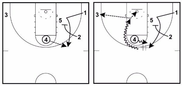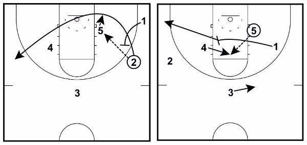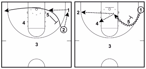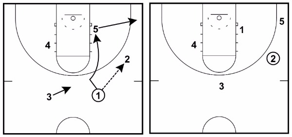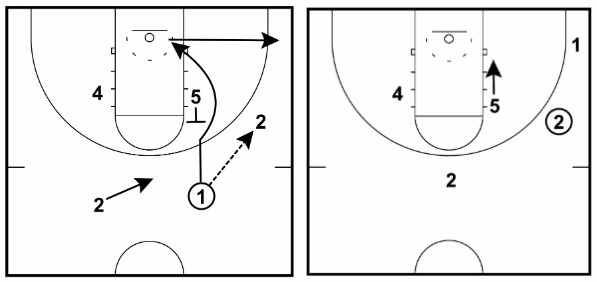 This can be the best option if 2 catches the basketball closer to the three-point line than usual or if it looks like 2 can make the immediate pass down low to 5.