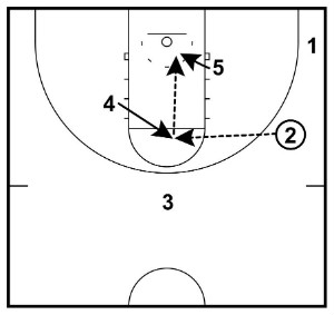 This entry involves the 5 screening across for 4 as they switch positions. This often opens up a quick pass inside from 2 to 4 as they cut to establish position on the low block.