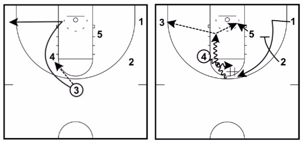3 slides to the top of the key and 4 moves to the mid-post area.