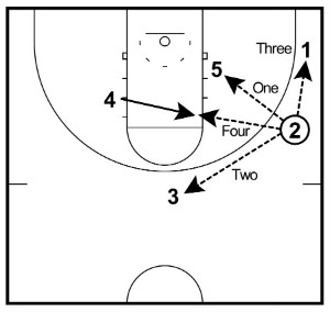When this pass is made, unless 5 is in position for a quick score, 1 must immediately cut along the baseline looking to receive a quick pass that can lead to a reverse layup. If they don’t receive the basketball, they cut out to the opposite wing.