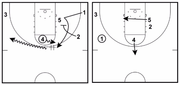 This signals for 4 to set a screen at the top for 1 who will be curling around the top of the key off 2’s down screen.