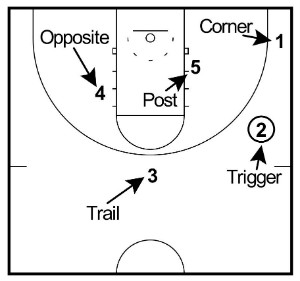 Position #2 – Trigger – The trigger is located on the wing and will usually possess the basketball after an entry. The passing option that they make from this position will dictate the entire offense so it’s important to put a smart player in this position.
